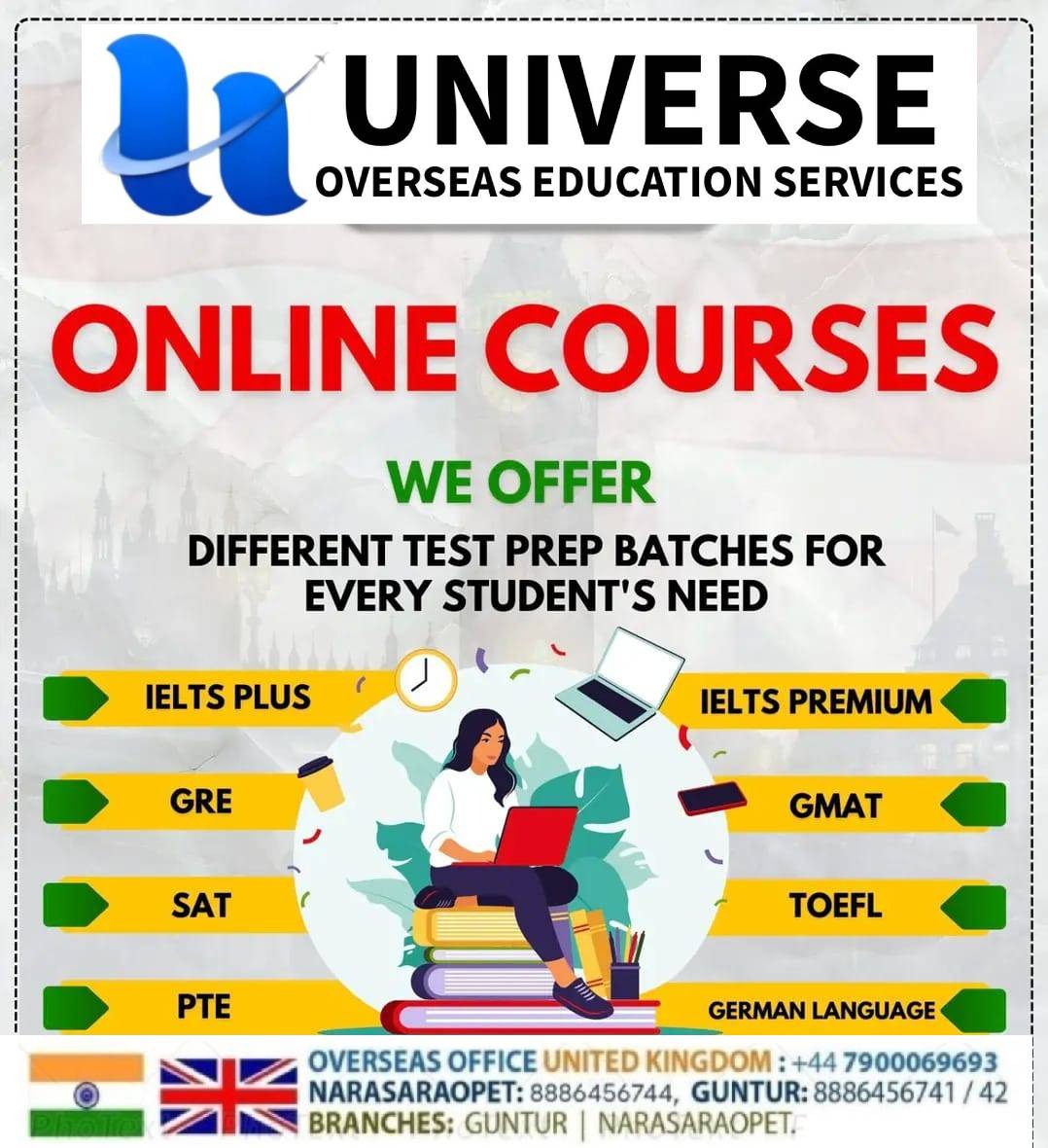 Elevate your career with Universe Overseas & Computer Institute! Whether you want to study in the UK, USA, Europe, Canada, or Australia, or master the latest tech skills, we are your trusted partner in Narasaraopet. π Overseas Education Services: Expert consultancy for top global destinations. Call: 88864 56744 or +91 80194 01283. π» Computer Courses with Placement: Gain expertise in high-demand software and programming: Languages: Python, Java, C, C++, C# Net, VB Net. Design & Office: Photoshop, DTP, MS Office. Business & Data: Tally Prime with GST, SQL Server, Oracle. Basics: Spoken English & Computer Classes. π Visit Us: Door No. 10-5-43, Arch Line, Arundalpet, Narasaraopet. π Cell: 76718 32132